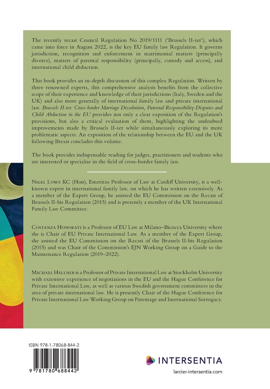 The recently recast Council Regulation No 2019/1111 (' Brussels II-ter' ), which came into force in August 2022, is the key EU family law Regulation. It governs jurisdiction, recognition and enforcement in matrimonial matters (principally divorce), matters of parental responsibility (principally, custody and access), and international child abduction. This book provides an in-depth discussion of this complex Regulation. Written by three renowned experts, this comprehensive analysis benefits from the collective scope of their experience and knowledge not only of their jurisdictions (Italy, Sweden and the UK) but also more generally of international family law and private international law. Brussels II-ter: Cross-border Marriage Dissolution, Parental Responsibility Disputes and Child Abduction in the EU provides not only a clear exposition of the Regulation's provisions, but also supplies a critical evaluation of these, highlighting the undoubted improvements made by Brussels II-ter while simultaneously exploring its more problematic aspects. An exposition of the relationship between the EU and the UK following Brexit concludes this volume.
