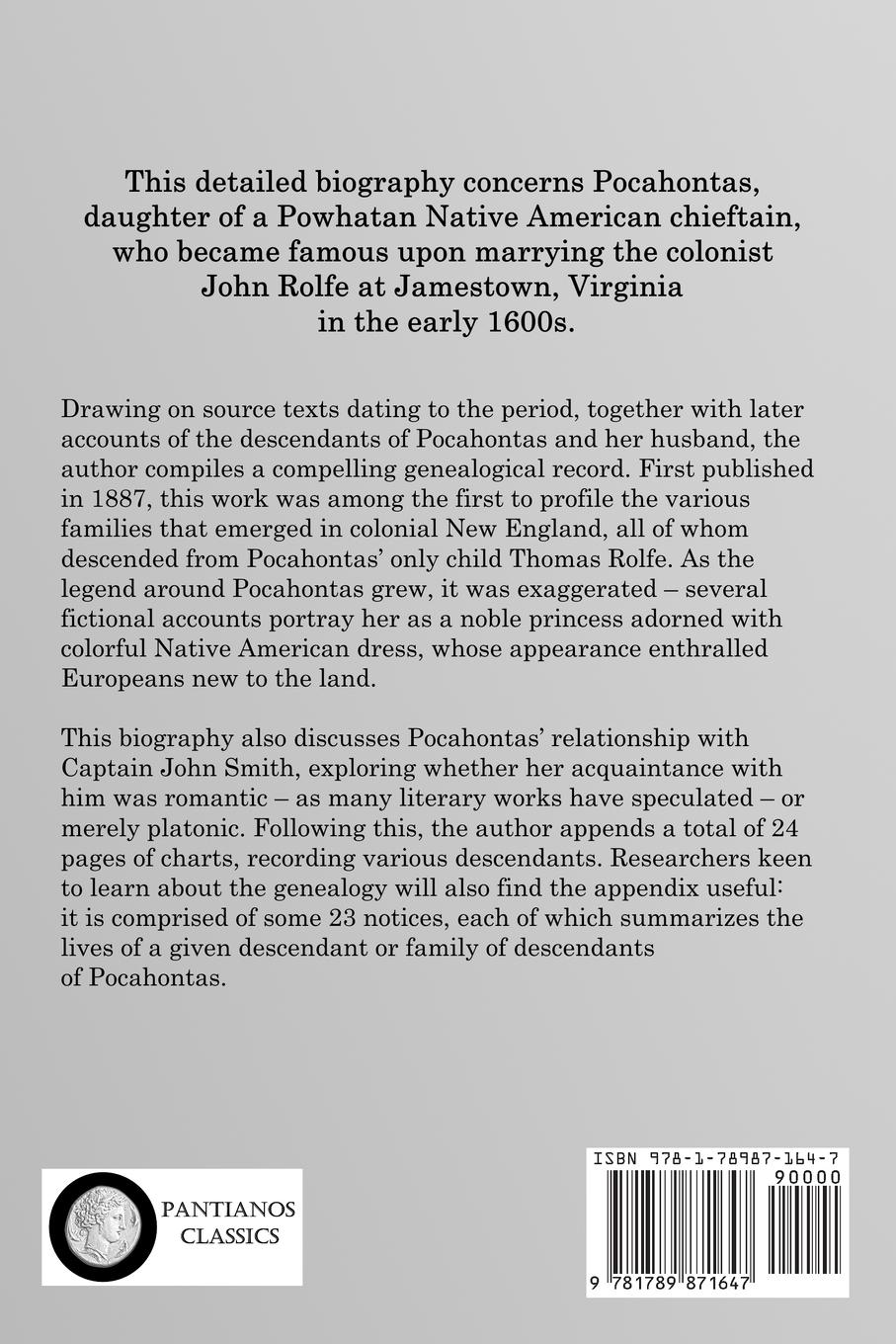 This detailed biography concerns Pocahontas, daughter of a Powhatan Native American chieftain, who became famous upon marrying the colonist John Rolfe at Jamestown, Virginia in the early 1600s. Drawing on source texts dating to the period, together with later accounts of the descendants of Pocahontas and her husband, the author compiles a compelling genealogical record. First published in 1887, this work was among the first to profile the various families that emerged in colonial New England, all of whom descended from Pocahontas' only child Thomas Rolfe. As the legend around Pocahontas grew, it was exaggerated - several fictional accounts portray her as a noble princess adorned with colorful Native American dress, whose appearance enthralled Europeans new to the land. This biography also discusses Pocahontas' relationship with Captain John Smith, exploring whether her acquaintance with him was romantic - as many literary works have speculated - or merely platonic. Following this, the author appends a total of 24 pages of charts, recording various descendants. Researchers keen to learn about the genealogy will also find the appendix useful: it is comprised of some 23 notices, each of which summarizes the lives of a given descendant or family of descendants of Pocahontas.