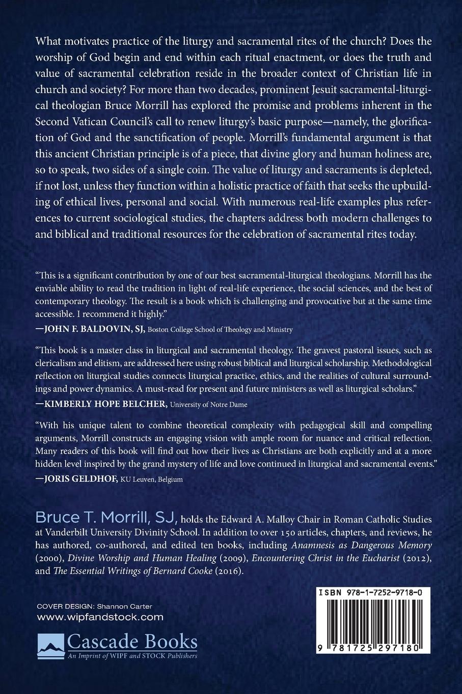 What motivates practice of the liturgy and sacramental rites of the church? Does the worship of God begin and end within each ritual enactment, or does the truth and value of sacramental celebration reside in the broader context of Christian life in church and society? For more than two decades, prominent Jesuit sacramental-liturgical theologian Bruce Morrill has explored the promise and problems inherent in the Second Vatican Council's call to renew liturgy's basic purpose--namely, the glorification of God and the sanctification of people. Morrill's fundamental argument is that this ancient Christian principle is of a piece, that divine glory and human holiness are, so to speak, two sides of a single coin. The value of liturgy and sacraments is depleted, if not lost, unless they function within a holistic practice of faith that seeks the upbuilding of ethical lives, personal and social. With numerous real-life examples plus references to current sociological studies, the chapters address both modern challenges to and biblical and traditional resources for the celebration of sacramental rites today.