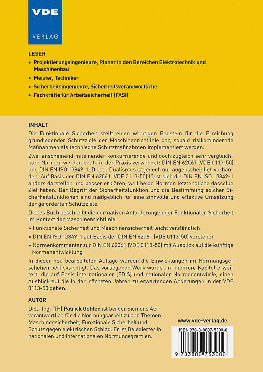 Die Funktionale Sicherheit stellt einen wichtigen Baustein für die Erreichung grundlegender Schutzziele der Maschinenrichtlinie dar, sobald risikomindernde Maßnahmen als technische Schutzmaßnahmen implementiert werden. Zwei anscheinend miteinander konkurrierende und doch zugleich sehr vergleichbare Normen werden heute in der Praxis verwendet: DIN EN 62061 (VDE 0113-50) und DIN EN ISO 13849-1. Dieser Dualismus ist jedoch nur augenscheinlich vorhanden. Auf Basis der DIN EN 62061 (VDE 0113-50) lässt sich die DIN EN ISO 13849-1 anders darstellen und besser erklären, weil beide Normen letztendliche dasselbe Ziel haben. Der Begriff der Sicherheitsfunktion und die Bestimmung solcher Sicherheitsfunktionen sind maßgeblich für eine sinnvolle und effektive Umsetzung der geforderten Schutzziele. Dieses Buch beschreibt die normativen Anforderungen der Funktionalen Sicherheit im Kontext der Maschinenrichtlinie. . Funktionale Sicherheit und Maschinensicherheit leicht verständlich . DIN EN ISO 13849-1 auf Basis der DIN EN 62061 (VDE 0113-50) verstehen . Normenkommentar zur DIN EN 62061 (VDE 0113-50) mit Ausblick auf die künftige Normenentwicklung In dieser neu bearbeiteten Auflage wurden die Einwicklungen im Normungsgeschehen berücksichtigt. Das vorliegende Werk wurde um mehrere Kapitel erweitert, die auf Basis internationaler (FDIS) und nationaler Normenentwürfe, einen Ausblick auf die in den nächsten Jahren zu erwartenden Änderungen in der VDE 0113-50 geben.