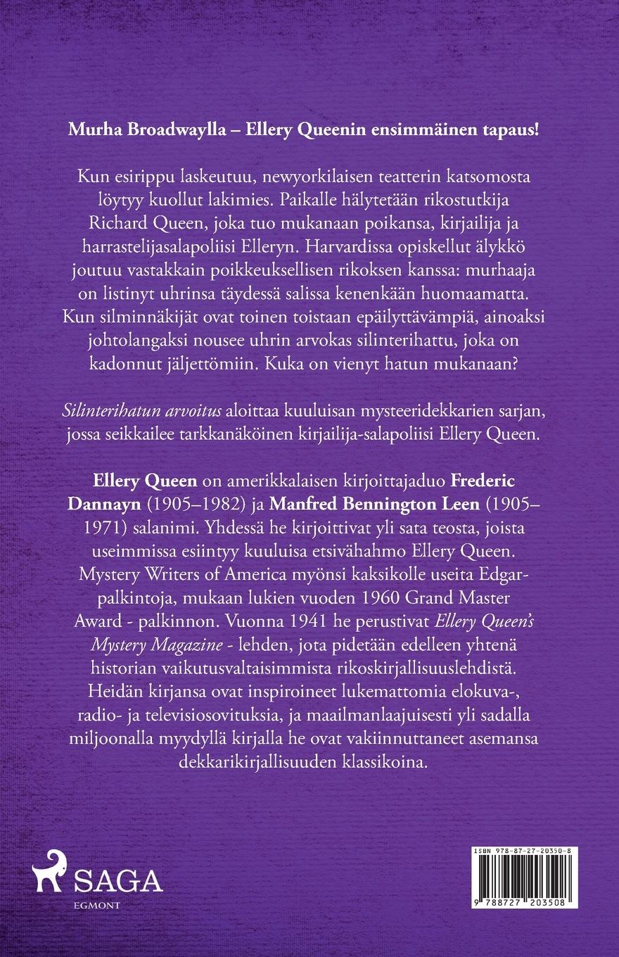 Murha Broadwaylla ¿ Ellery Queenin ensimmäinen tapaus! Kun esirippu laskeutuu, newyorkilaisen teatterin katsomosta löytyy kuollut lakimies. Paikalle hälytetään rikostutkija Richard Queen, joka tuo mukanaan poikansa, kirjailija ja harrastelijasalapoliisi Elleryn. Harvardissa opiskellut älykkö joutuu vastakkain poikkeuksellisen rikoksen kanssa: murhaaja on listinyt uhrinsa täydessä salissa kenenkään huomaamatta. Kun silminnäkijät ovat toinen toistaan epäilyttävämpiä, ainoaksi johtolangaksi nousee uhrin arvokas silinterihattu, joka on kadonnut jäljettömiin. Kuka on vienyt hatun mukanaan? Silinterihatun arvoitus aloittaa kuuluisan mysteeridekkarien sarjan, jossa seikkailee tarkkanäköinen kirjailija-salapoliisi Ellery Queen.