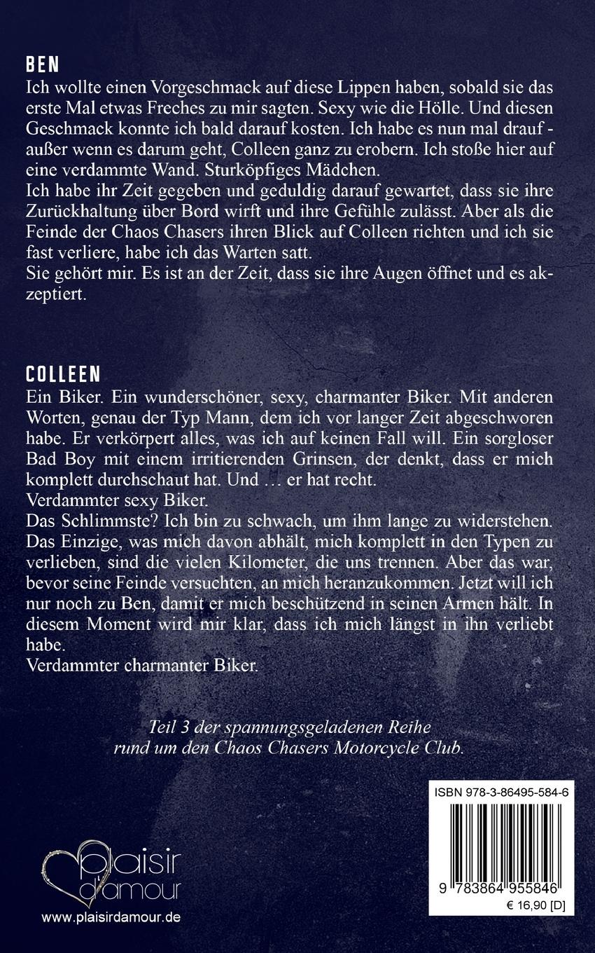 BEN Ich wollte einen Vorgeschmack auf diese Lippen haben, sobald sie das erste Mal etwas Freches zu mir sagten. Sexy wie die Hölle. Und diesen Geschmack konnte ich bald darauf kosten. Ich habe es nun mal drauf - außer wenn es darum geht, Colleen ganz zu erobern. Ich stoße hier auf eine verdammte Wand. Sturköpfiges Mädchen. Ich habe ihr Zeit gegeben und geduldig darauf gewartet, dass sie ihre Zurückhaltung über Bord wirft und ihre Gefühle zulässt. Aber als die Feinde der Chaos Chasers ihren Blick auf Colleen richten und ich sie fast verliere, habe ich das Warten satt. Sie gehört mir. Es ist an der Zeit, dass sie ihre Augen öffnet und es akzeptiert. COLLEEN Ein Biker. Ein wunderschöner, sexy, charmanter Biker. Mit anderen Worten, genau der Typ Mann, dem ich vor langer Zeit abgeschworen habe. Er verkörpert alles, was ich auf keinen Fall will. Ein sorgloser Bad Boy mit einem irritierenden Grinsen, der denkt, dass er mich komplett durchschaut hat. Und ... er hat recht. Verdammter sexy Biker. Das Schlimmste? Ich bin zu schwach, um ihm lange zu widerstehen. Das Einzige, was mich davon abhält, mich komplett in den Typen zu verlieben, sind die vielen Kilometer, die uns trennen. Aber das war, bevor seine Feinde versuchten, an mich heranzukommen. Jetzt will ich nur noch zu Ben, damit er mich beschützend in seinen Armen hält. In diesem Moment wird mir klar, dass ich mich längst in ihn verliebt habe. Verdammter charmanter Biker. Teil 3 der spannungsgeladenen Reihe rund um den Chaos Chasers Motorcycle Club.