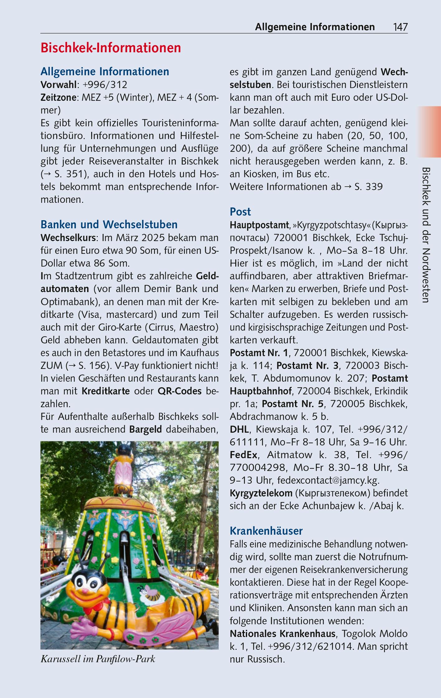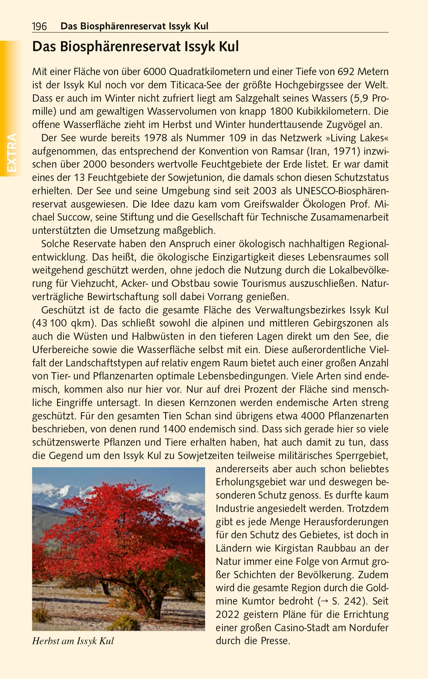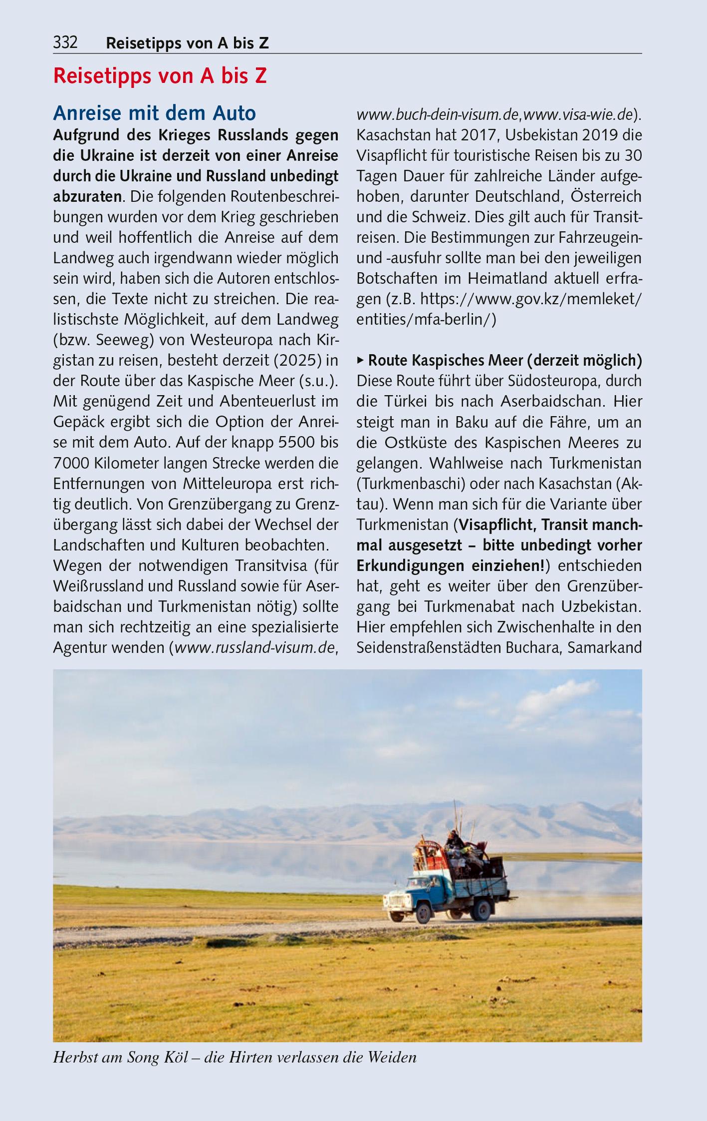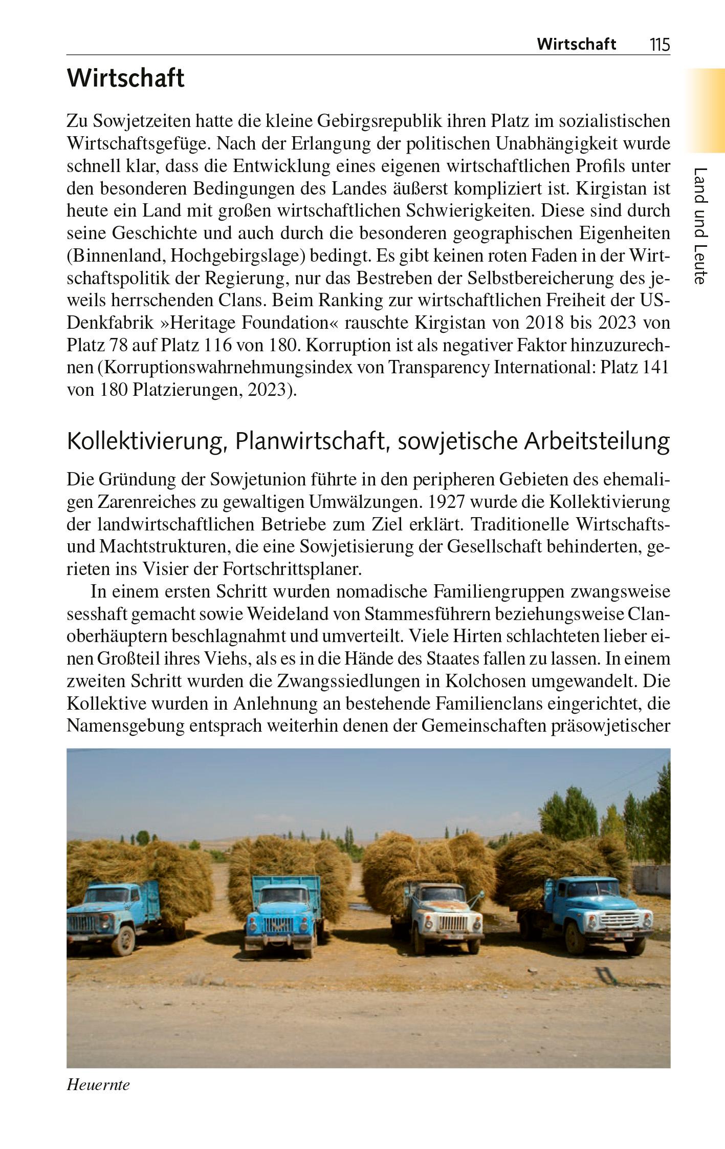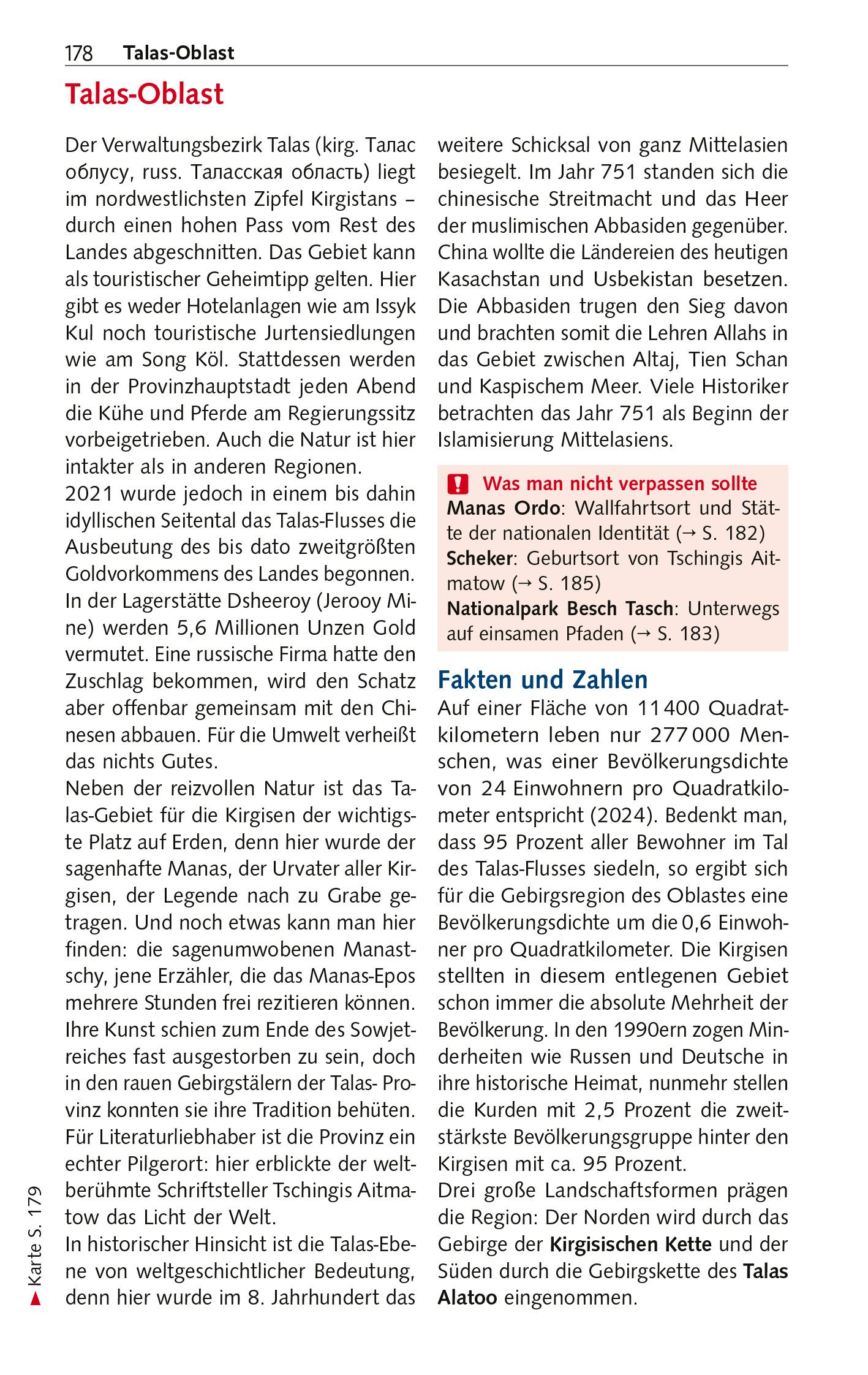 Eisriesen, Steppen und Halbwüsten, Jurten und Pferdeherden - Kirgistan am Fuß des Tien-Schan-Gebirges fasziniert durch einzigartige wilde Landschaften. Der Trescher-Reiseführer KIRGISTAN begleitet kompetent durch das zentralasiatische Hochgebirgsland. Eine Reise durch Kirgistan ist ein großartiges Abenteuer. Von der Hauptstadt Bischkek geht es direkt hinauf zu den Fünftausender-Gipfeln. Bis in die Geröll- und Gletscherzone reicht der Nationalpark Ala-Artscha, das Naherholungsgebiet der Bischkeker. Schneebedeckte Zinnen rahmen den weltgrößten Hochgebirgssee Issyk Kul ¿ Biosphärenreservat und mit sommerlichen Wassertemperaturen um 20 Grad beliebt bei Badeurlaubern. Am Gebirgssee Song Köl kann man auf den Sommerweiden der kirgisischen Halbnomaden komfortabel in Jurtencamps nächtigen. Der Pik Lenin im kirgisischen Pamir oder die zwei Siebentausender im Tien Schan sind dagegen herausfordernde Trekking- und Bergsteigerziele. Noch völlig unerschlossene Regionen wie das malerische Besch-Tasch-Tal lassen sich ebenfalls am besten mit heimischen Guides erwandern. Am Rand des Fergana-Becken erhebt sich in der Stadt Osch der Sulajman Too, sagenhafte Ruhestätte des König Salomo, muslimischer Wallfahrtsort und UNESCO-Welterbe. Ob Karakol mit russischer Holzkirche oder Özgön mit Minaretten - Moscheen, Basare und die Architektur aus sowjetischer Zeit prägen die Städte. Der bunte Bevölkerungsmix aus Kirgisen, Usbeken und Russen pflegt seine Traditionen, und auch die nomadische Volkskultur ist lebendig. Für Rucksackurlauber besteht eine relativ gute Infrastruktur. Hotels und Gästehäuser finden sich in den zentralen touristischen Orten. Mit vielen Informationen dient der Trescher-Reiseführer KIRGISTAN schon bei der Reisevorbereitung. Der einzige deutschsprachige Titel zur Destination bietet profundes Hintergrundwissen zur Geschichte, Gesellschaft und Landesnatur, zu Traditionen und Volkskultur. Alle Sehenswürdigkeiten, Orte und Regionen werden ausführlich vorgestellt. Zu Vorschlägen für Wanderungen und Trekkingtouren kommen reisepraktische Tipps von Transport und Verkehr über Unterkunft, Gastronomie und Einkaufen bis zu lokalen Guides und Reiseveranstaltern. Zahlreiche Übersichtkarten und ein Sprachführer Russisch-Kirgisisch-Deutsch komplettieren das Buch zum perfekten Weggefährten durch das Hochgebirgsland. ... weitere Reiseführer zu Zentralasien finden Sie auf der Website des Trescher Verlags.
