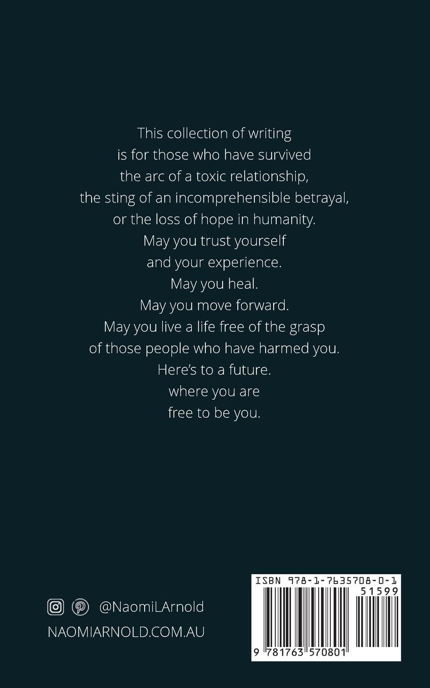 This collection of writing is for those who have survived the arc of a toxic relationship, the sting of an incomprehensible betrayal, or the loss of hope in humanity. May you trust yourself and your experience. May you heal. May you move forward. May you live a life free of the grasp of those people who have harmed you. Here's to a future. where you are free to be you.